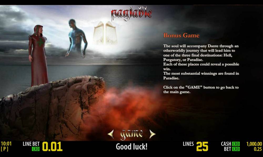 The prize game of «Dante’s Hell» slot machine is designed in the same style as in two other slots of the trilogy. You go to the special scree, where you would see a soul leading the author of the poem to the hell, paradise or purgatory. Then you would be awarded with a bonus payoff, which amount partly depends on the bet, but finally determined randomly.