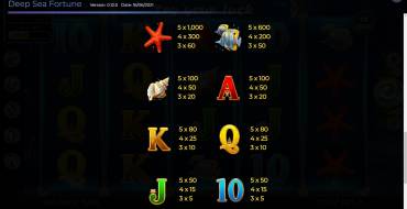 The Deep Sea Fortune slot machine from the Spinomenal provider has a standard playing field, consisting of 5 reels with 4 symbols. Payouts are made on 10 lines. The minimum bet is 10 cents, and the maximum - is 100 dollars per spin.