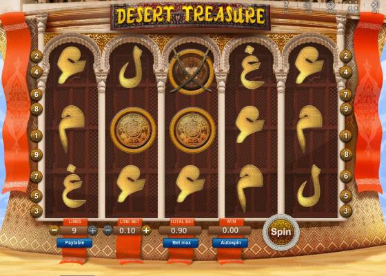 Playing Desert Treasure slot machine is possible by the bet in amount of 0.10, 0.25, 0.50, 0.75 or 1 dollar per line. Consequently, the maximal acceptable bet per round is nine dollars here.