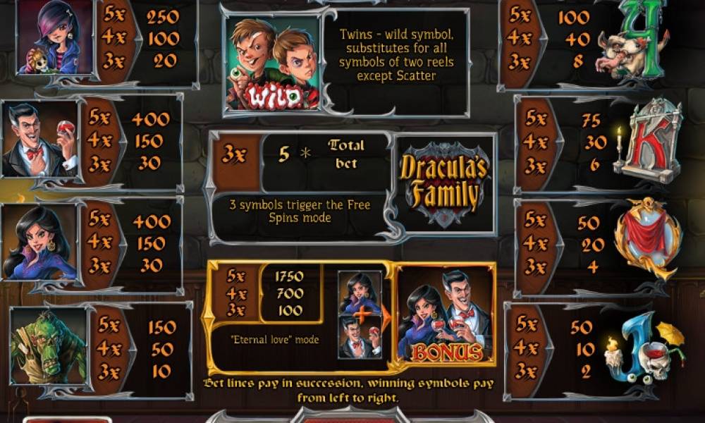 The gaming symbols, which you can see at the screen of Dracula’s Family video slot, are images of the head of the family, his wife, children, a domestic monster and stylized signs of the values of playing cards from jack to ace. Except of them, there are also several special symbols in this game, such as Wild (twins) and Scatter (a logo of Dracula’s Family). We would like to discuss its functions below: