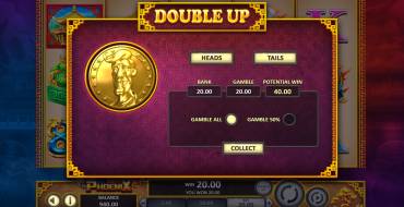 It is possible to withdraw the win right away or to try increasing it in the gambling feature, which takes place at a new screen. You can stake the whole amount of the win or a half. The condition is to guess a side of the coin. If you are lucky, your payoff is doubled. If not – you lose the bet. It is possible to play unlimited times.