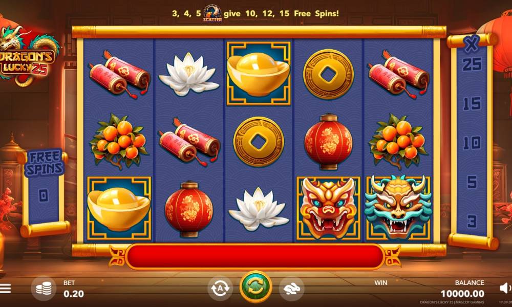 Romanian provider Mascot Gaming released an Asian-themed slot called Dragon's Lucky 25 at the end of January 2024. It got the common mechanics: 5 reels with symbols in 3 rows, 20 fixed paylines, and a couple of standard chips - risk round and free spins. Bets can be placed from 0.2$.