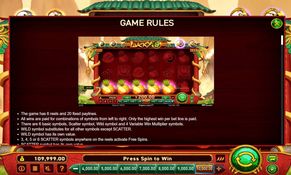 These features make the Dragons Lucky 8 slot suitable for players with different dynamics. Whether you like to play with frequent wins, or opt for big wins, customize the volatility to suit you.