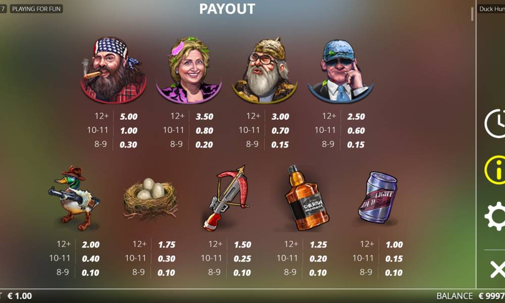 The playing field in the Duck Hunters online slot consists of 6 reels with 5 cells on each. Symbols are counted according to the Pay Anywhere principle, where the main thing is their number. In total, the machine uses 9 ordinary, 2 special and a few bonus symbols. There is practically no limit to the possible lines, which affected the payout table with very modest multiplier values. Do not worry about this, because the game is also present and bonuses, the main of which is Multiplier. Sometimes even in normal mode manages to increase the value of the multiplication of the winnings to very nice figures. The maximum win is x30000 at a bet of 100 euros. Hence the extremely high volatility. Free spins take place on the same playing field, but have their own bonuses that allow you to multiply the size of prizes.
