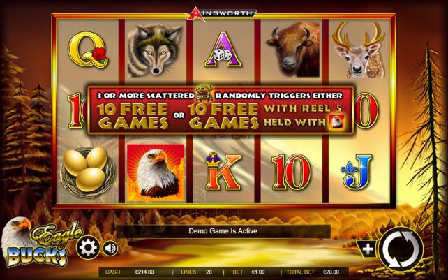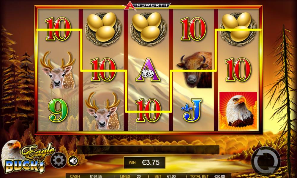 The gaming symbols imaged at the screen of «Eagle Bucks» video slot are card signs from nine to ace, eggs in the nest, a buffalo, a deer, a wolf and a rock view.