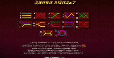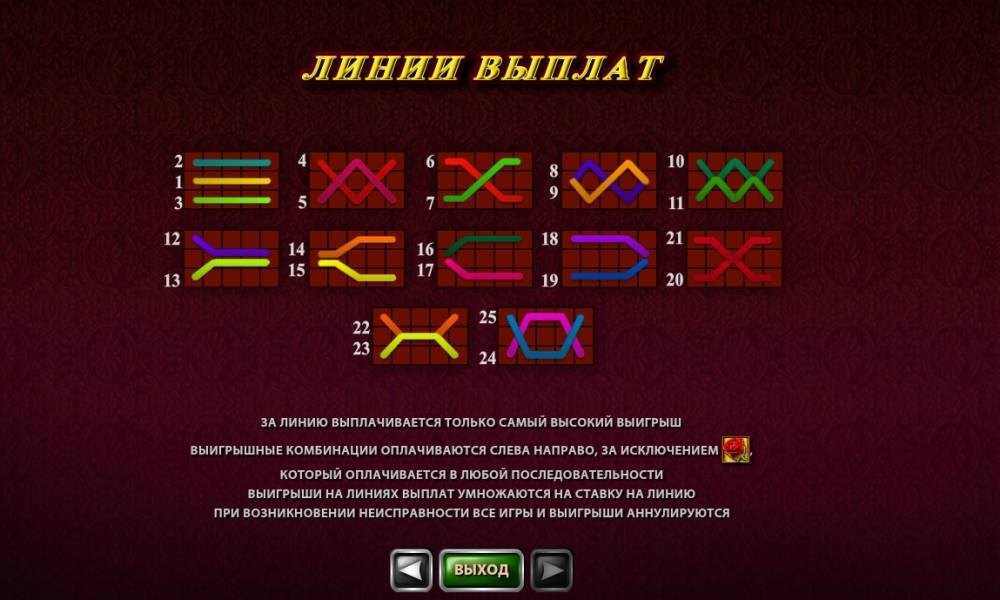 The pay table shows the coefficients of combinations, the layout of active lines and brief rules of the game. All the nuances are discussed in more detail in the help.