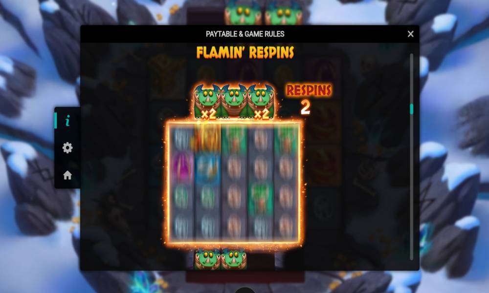 Flamin' Respins. If the top or bottom extra rows are filled with Fang, 3 respins will start. The Fang remains in place for the duration of the respins, so there is a higher chance of triggering Flamin' Wild.