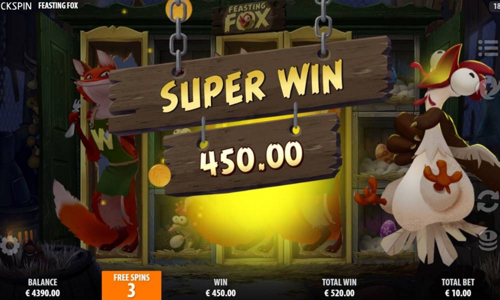 I am fascinated by the Feasting Fox game. Simple and amusing, it's fun enough, but that's from the fox's point of view. Things take on a tragic tone for the poor hens, as the insatiable predator steals the hens right out of their home henhouse. Their eyes pop out of their orbits from fear, and the won coins fall from the beak opened in death agony. Not a second of calm - carnivorous licking ginger hunter is visible through the cracks in the wooden walls of the coop, he is always near, he waits. Together with him, players wait for favorable combinations of symbols and the launch of bonus features to get each of their own: the fox - a tasty dinner, the gamer - a pleasant win.