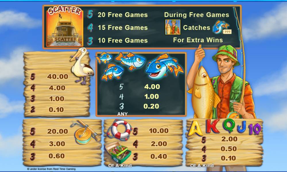 Cash Symbol is a fish, which are represented by several species. In the base game they bring a payout for 3 or more pieces on a line, and in the bonus game they are like special symbols collected by the fisherman. They have values from x2 to x50.