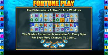 The playing field consists of five reels of three rows each. The online slot has 10 fixed paylines. Symbols include standard card symbols as well as themed images such as fishing gear, boats and various types of fish. 5 types of low and high paying symbols are used each. Winning combinations are formed when symbols match on active lines from left to right. Pelican gives a payout from 2 pieces, and all other symbols - from 3. The Fortune Spins feature allows you to activate additional sets of reels, increasing your chances of winning. There is also a free spins round, during which users can catch money fish. The maximum prize is large - x50000 of the bet. But the range of possible amounts is modest - 0.1-10 euros.