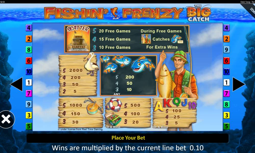 The Fishin Frenzy The Big Catch slot from the provider Blueprint has classical playing field, which consists of 5 reels with 3 symbols each. All payouts are made on 10 paylines.
