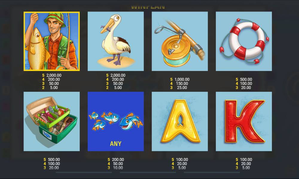 Wild symbol - fisherman, which gives independent payouts and as part of other combinations. Can appear in any place on the playing field. Collects fish and pays their value. If a golden fisherman appears, he also gives a random multiplier.