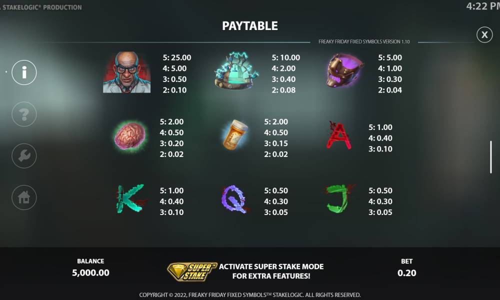 The Freaky Friday Fixed Symbols slot machine from the Stakelogic provider has a standard playing field, consisting of 5 reels with 4 symbols. Payouts are made on 20 lines.