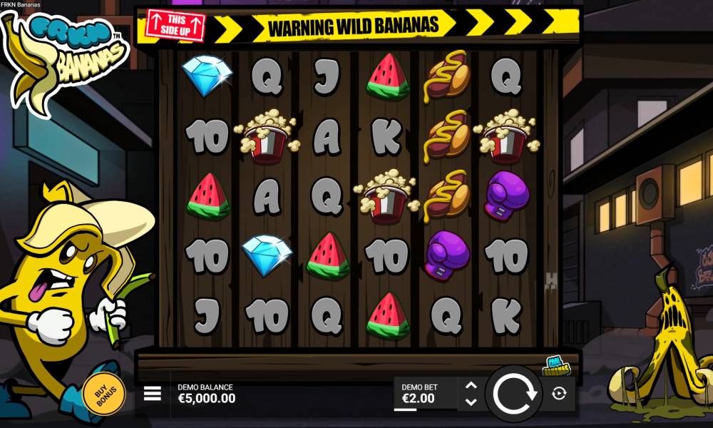 In the online slot FRKN Bananas the interface is allocated a minimum of space. Under the playing field is the main menu, betting options and buttons to start spins. A little to the left you can find the "Buy Feature" button. Start the game is very simple: