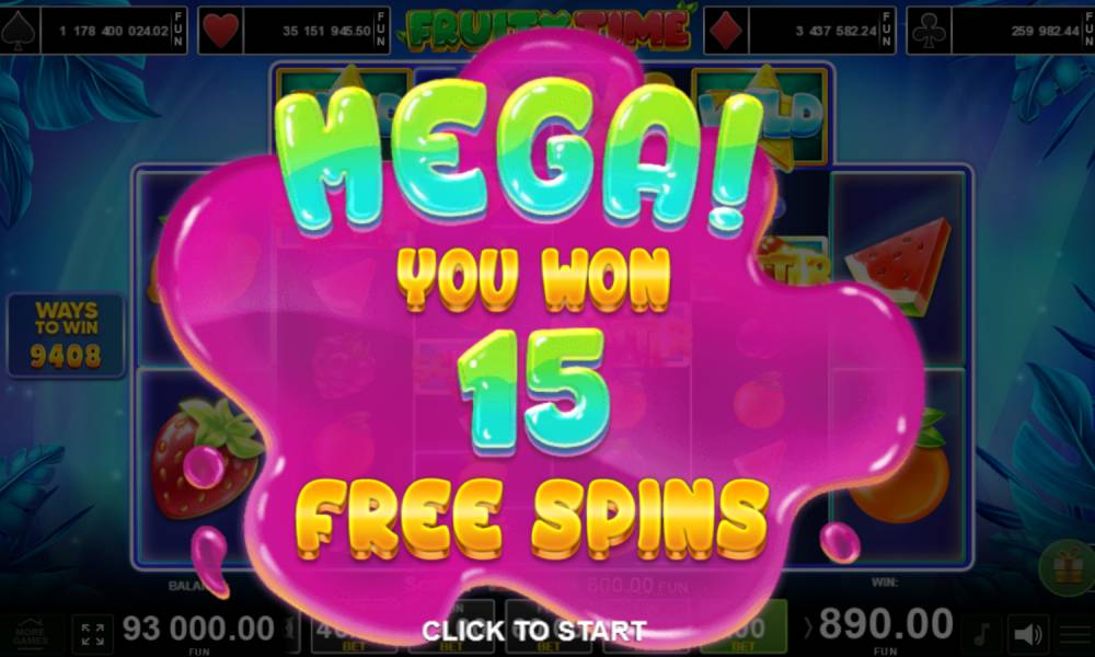 Fruity Time slot machine has 6 vertical reels and 1 horizontal reel. The playing field can vary from 2x3x3x3x3x3x2 to 7x8x8x8x8x8x7, depending on how many symbols fall on the columns. In total, there are 4 low, 4 medium and 2 high paying types of symbols in the game. All of them make combinations of 3-6 pieces on the field. Chains collected from the first reel in a row are counted. This gives 200704 lines to win at most. The game features free spins, Jackpot Cards and Gamble rounds. There is also a purchase bonus, which allows you to take matters into your own hands rather than waiting for luck. The betting range is large from 0.01 to €1,000.
