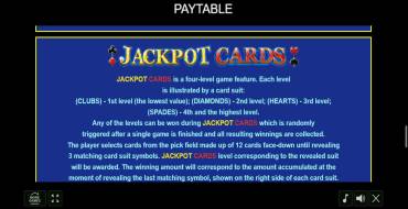 Getting the progressive jackpot is only possible with a lot of luck. The Jackpot Cards round is activated independently and quite rarely. At this point, 12 cards appear on the field, lying shirt-side up. The user must click on them one by one. The cards will turn over and show their suit. The game will end when there are three identical aces on the field - spades, clubs, diamonds or hearts.