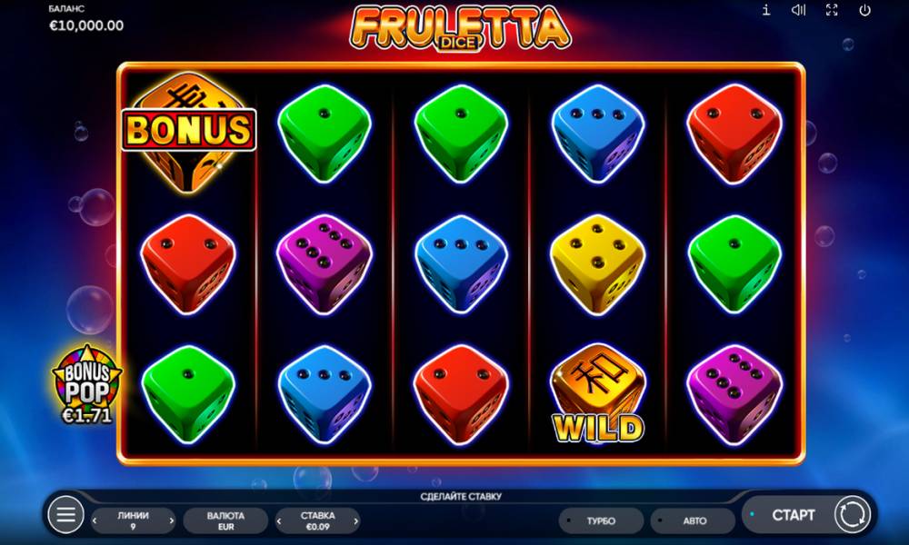 On the standard Fruletta Dice field, the return to player (RTP) ratio is 96.04%, which is acceptable. In the Bonus Pop, the ratio is 93.23-95.25%.