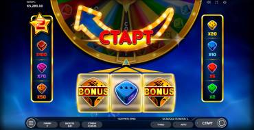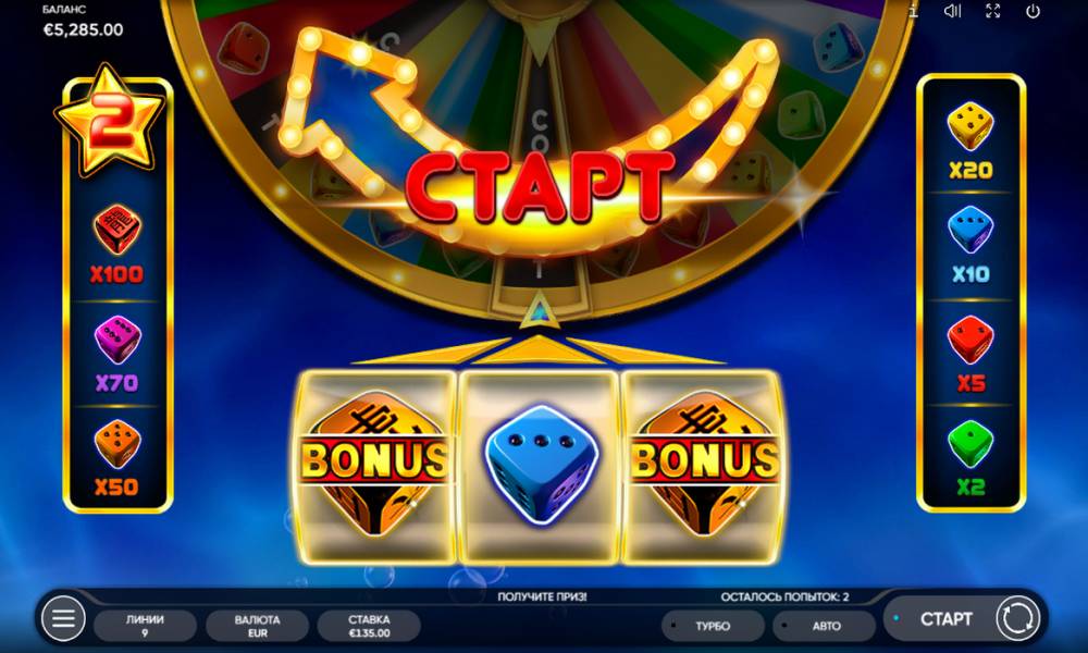 "Wheel of Fortune. Activated when 3 Bonus symbols fall out, this starts one bonus round, the appearance of 4 or 5 symbols starts 2 or 3 rounds respectively. After pressing the Start button, the game goes automatically. Three dice fall out randomly, they must match in color with those that appear on the prize wheel. Each dice has its own multiplier to win, the maximum reaches x100 to the bet. The game lasts until the moment the reel does not fall Collect. All wins are summed up and multiplied by the total bet. The game can be purchased.