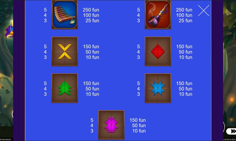 In the Full Moon Magic from provider Belatra, a 5-reel, 4-cell-high playing field is used. Combinations are made up of 20 winning directions, from 3 symbols in a row (or through the joker), from left to right. A series of spins consists of 10 attempts, during which all falling Wild symbols leave behind frames. The last spin fills the cells again, sometimes with multipliers. The normal mode uses bonuses in the form of stacks of signs, and freespins can only be activated after Scatter symbols fall out. The bet has a range from 0.2 to €50, with maximum winnings capped at x5000.