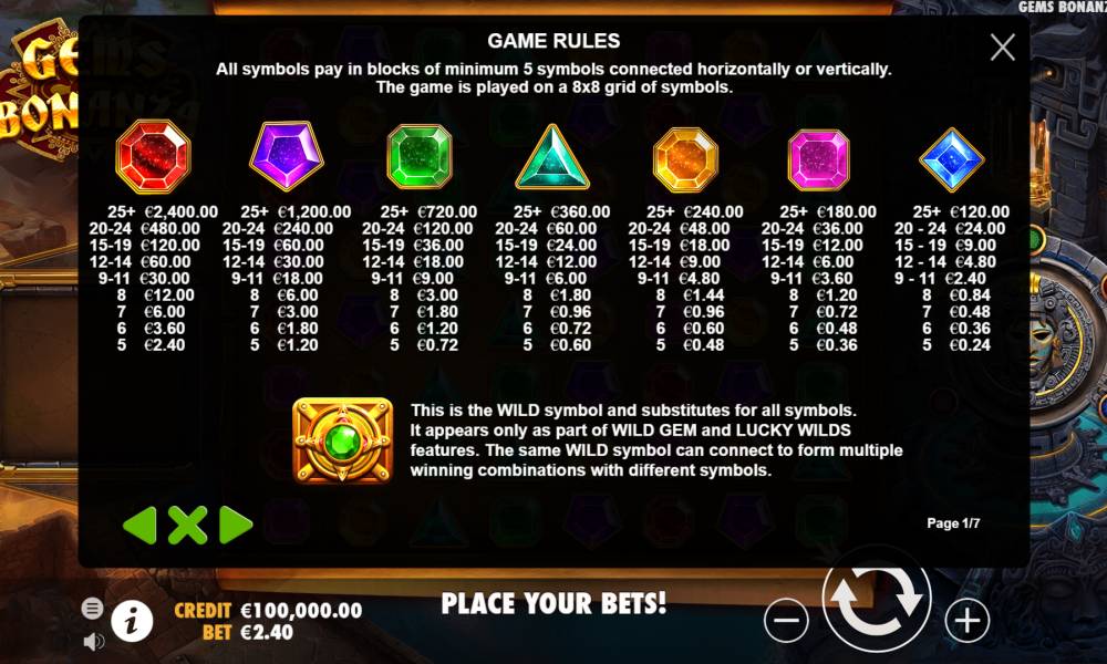 The Gems Bonanza slot machine from the Pragmatic Play provider has a standard 8x8 playing field. Payouts are made on the Cluster Pays system.