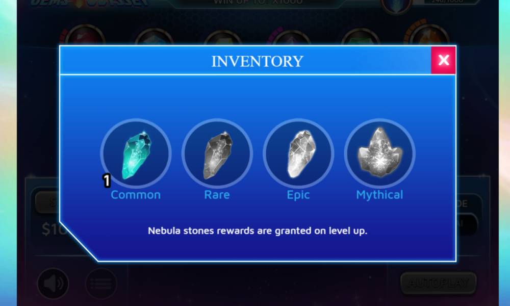 Level Up. Moving to a higher level occurs only after the right number of points is collected. They are awarded for each winning combination. If Nebula Stones were available at the moment of transition, the player receives prize multiplications to the bet according to the type of crystals.
