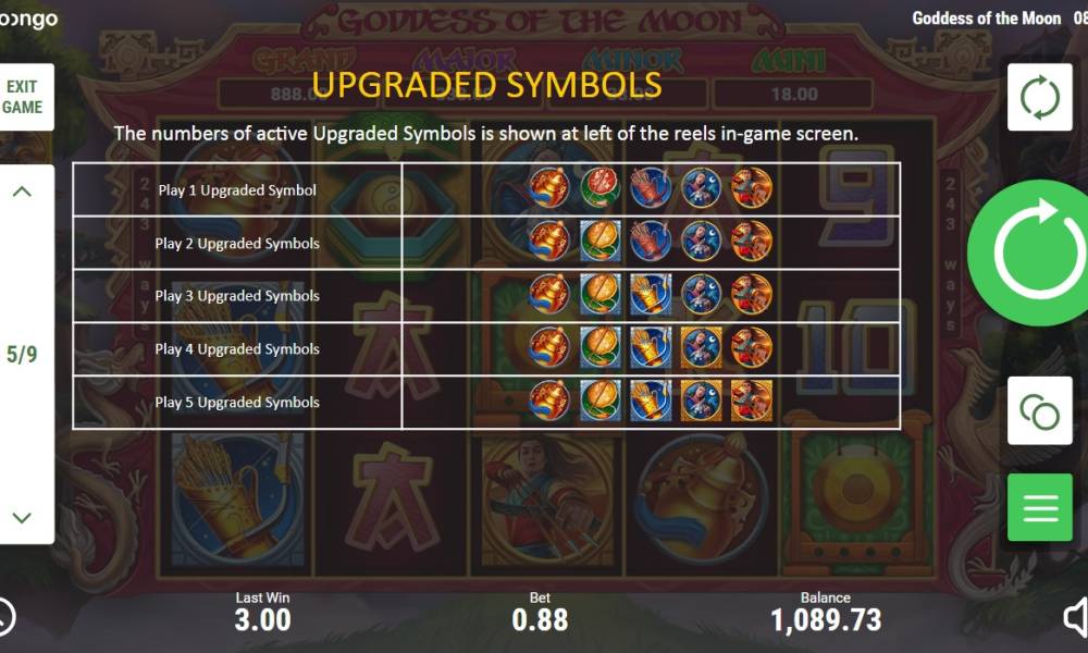 «Goddess of the Moon» is provided with basic symbols, a Wild, a Scatter, four jackpots and free spins with bonus options, presented in multiply varieties.