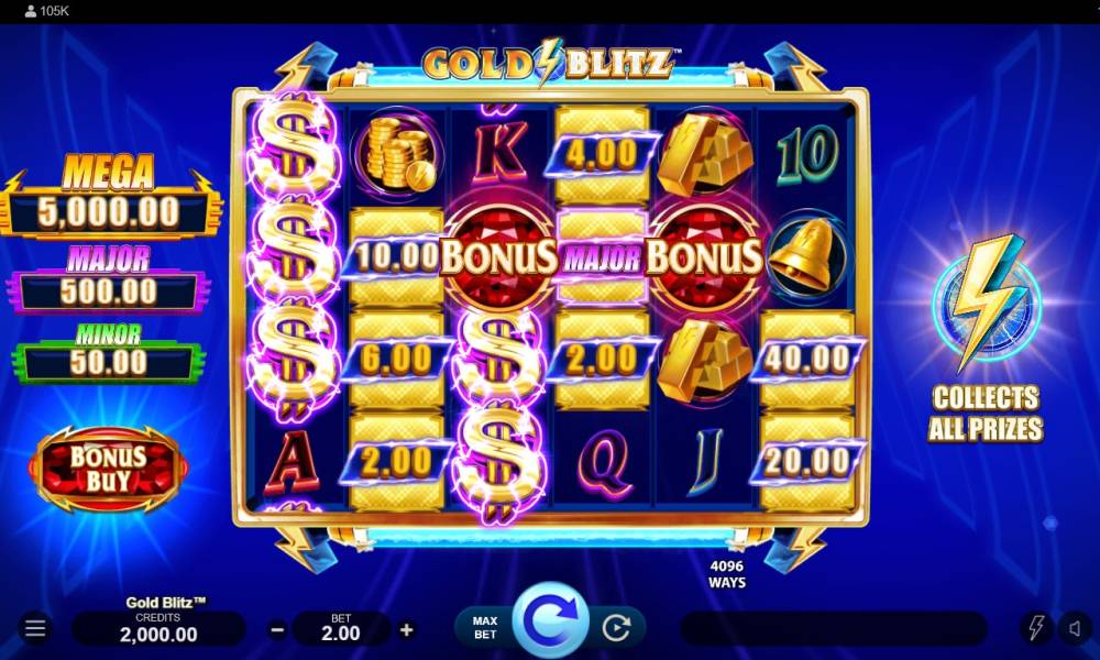 The Gold Blitz gives you the chance to win 3 types of jackpots: Minor (x50), Major (x500) and Mega (x5000), aka the biggest win in this online slot. All of them can fall in the Gold Blitz bonus round.