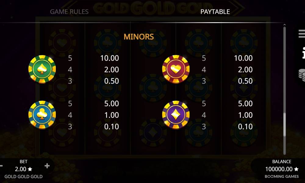 Spring 2023 studio Booming Games (Malta) has added Gold Gold Gold to its portfolio. This is a slot with simple mechanics and the ability to choose the number of paylines. It should appeal to those who are not looking for complex bonus features, which can be confused. The theme of the slot is dedicated to gold: the entire interface is made in this coloring. You can get a maximum of x2000 from the bet. There are free spins, which can only win. Of unusual: the number of paylines can be changed from 1 to 20.