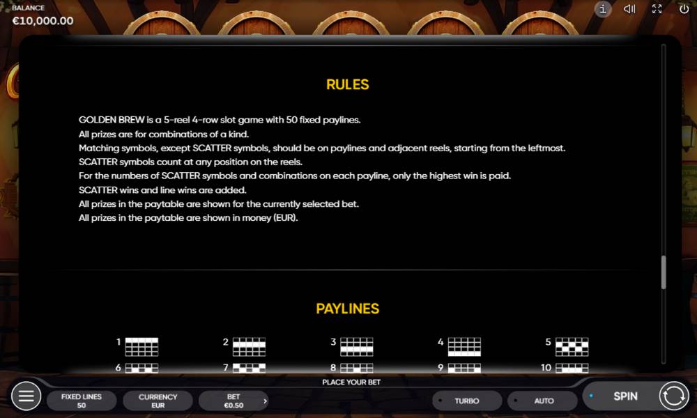 The Golden Brew video slot features 5 reels in 4 rows and 50 fixed paylines. To get a payout you need to have the same symbols fall out on the neighboring reels, counting from the left edge. The Scatter symbol counts regardless of where it appears. Winnings for scatters and combinations on different lines are summarized. The range of bets - from 0.50 to 150 euros. All symbols involved in the game, give a certain multiplier to the bet in the case of falling on the reels in the number of 3 or more (for the symbol Girl - 2 or more). The values of multipliers are collected in the pay table.