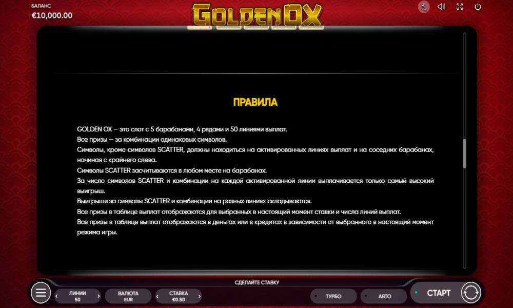 Golden Ox game comes on 5 reels in 4 rows and 50 paylines. The betting range is defined in sizes from 0.5 to 200 coins. For a winning combination requires a combination of identical symbols in a row on neighboring reels, accounting is carried out from left to right from the leftmost reel. The Scatter symbol is counted anywhere. When falling out the same symbols in the number of 3 or more (for some - 2 or more), the set rate is multiplied by the coefficient. Its value depends on the number of symbols on the field. The minimum multiplier is x0.1, the maximum - x2 to the bet.