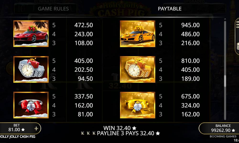 In Holly Jolly Cash Pig the game is played on a 5x4 field with payouts on 30 lines. It is impossible to change their number. All lines work according to the classic principle: they start on the first left reel, must consist of 3+ symbols. In addition to line payouts, there is a Piggy Bank feature: the slot also pays when Coin and Collect symbols appear. There are a total of 17 symbols in the slot. Of these, 13 are simple. Simple symbols are divided into 3 groups: junior (5 pieces), senior (4 pieces) and golden senior (4 pieces). Gold senior symbols are completely copying the regular senior symbols, only the payout for them is 2 times bigger. The Golden Seniors can only appear in freespins after triggering the Major Upgrade feature.