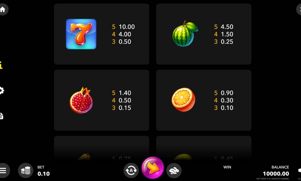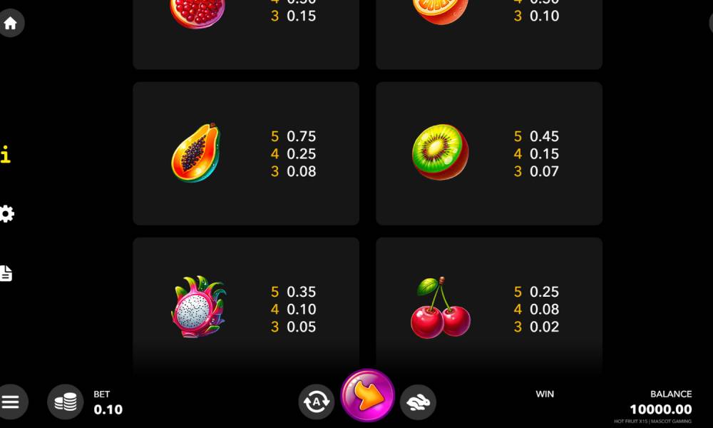 Fans of bright design will definitely love Hot Fruit x15, because the interface is colorfully designed. There are few functional elements on the screen, almost all of them are placed at the bottom. To the right of the field is drawn a board with growing Win Multiplier. The active multiplier is highlighted. All buttons are divided into 3 groups. On the bottom left there is the menu and bet change. If you click on the menu, a page with 3 sections will open: pay table, settings and general information about the slot. Below the field in the center are 3 buttons: autospins, manual start of the reels and speed up (or slow down if the reels are already spinning fast). Autospin has many settings for stopping: by the number of spins, decreasing or increasing the balance, when you get a win. In the lower right corner there is a button to turn on/off the sound, the current balance and the size of the received payout. Gambler who decided to play Hot Fruit x15, we recommend: