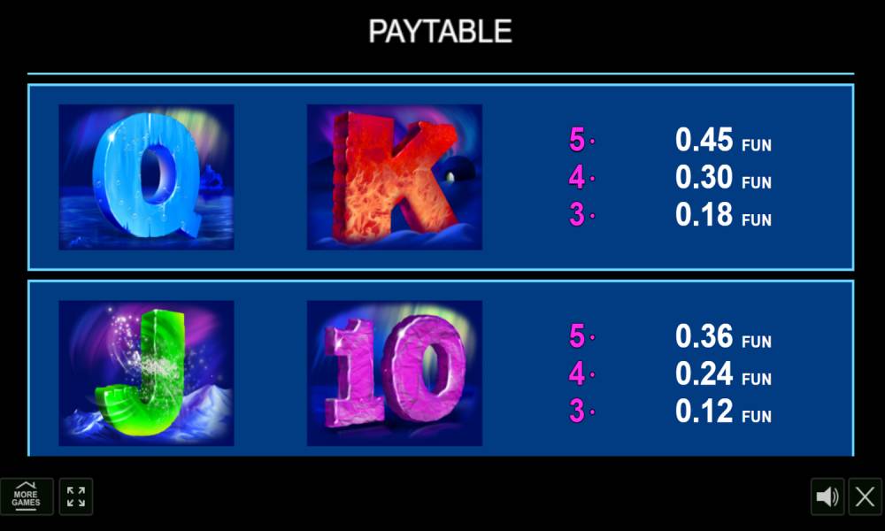 The playing field of the online slot Ice Valley has a size of 5x4. Lines for payouts 1024, as combinations are made up of identical symbols on neighboring reels, starting from the leftmost in a row. All symbols (4 junior and 4 senior) pay for 3-5 pieces. There are also special symbols with bonus features. The provider added a Gamble round, jackpots and a special zone on the field. All this helps to get big prizes (maximum x250 of the bet). On a spin, users can bet any amount in the range of 0.01-1000 euros.