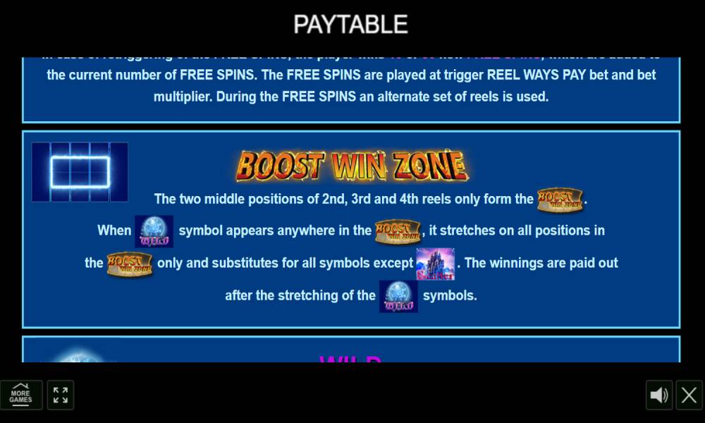 Boost Win Zone. These are the two dedicated positions centered on the 2nd, 3rd and 4th reel. Six cells make up the special zone that boosts the action of the bonus symbols. When a Wild symbol lands in this area, it expands to the entire Boost Win Zone. If the Scatter symbol ends up on a dedicated part of the reels, it gives more free spins.