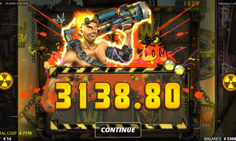 Infectious Spins: Toxic Hazard. Three Bonus symbols give you 9 free spins and four give you 10 free spins. On the three center reels on each spin will stop from 1 to 5 Wild symbols. This gives you the opportunity to activate the Infectious xWays feature every time an xWays symbol is rolled, which will always show only expensive symbols.