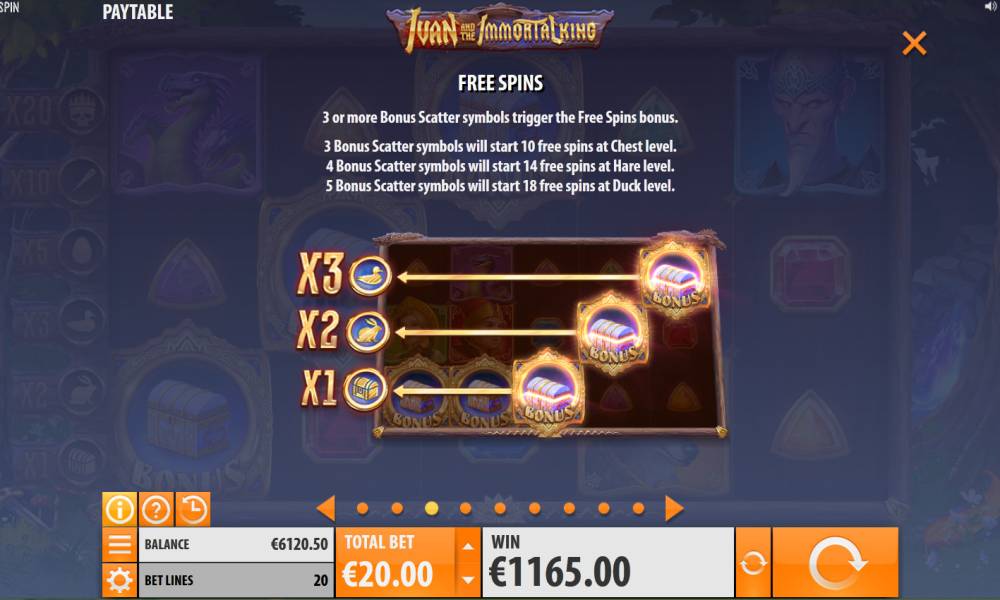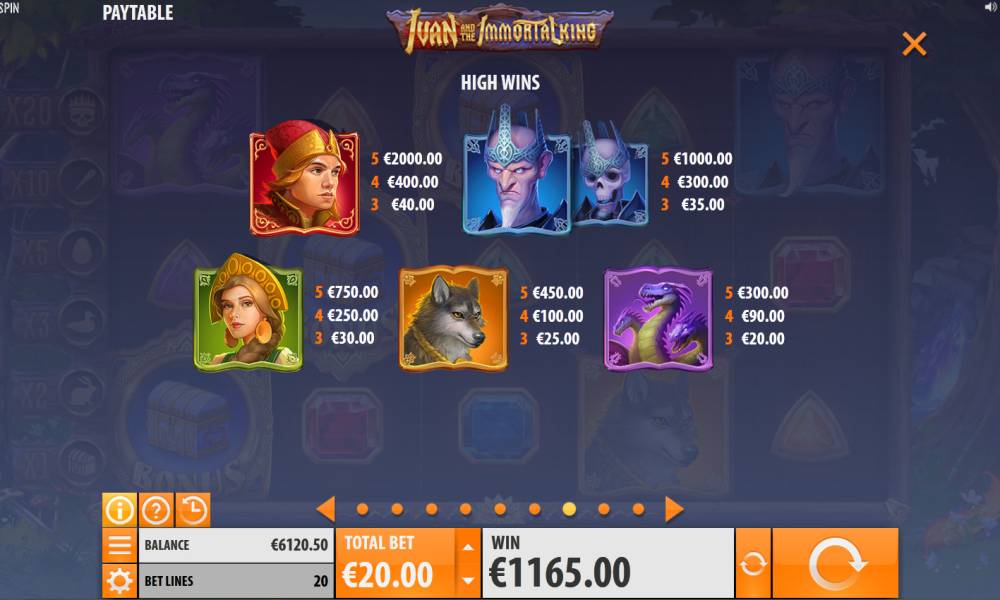 The Ivan and the Immortal King video slot has five reels and twenty pay lines, which are always active on default.