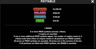 The slot gives you a chance to win 4 jackpots: Mini x10, Minor x50, Major x250, Grand x1000. Any of these can only be won in the J Mania or Super J Mania rounds. In both rounds, the first 3 jackpots can appear on Prize or Super Prize symbols. The biggest jackpot is paid if you fill all 15 cells in the J Mania or Super J Mania rounds.