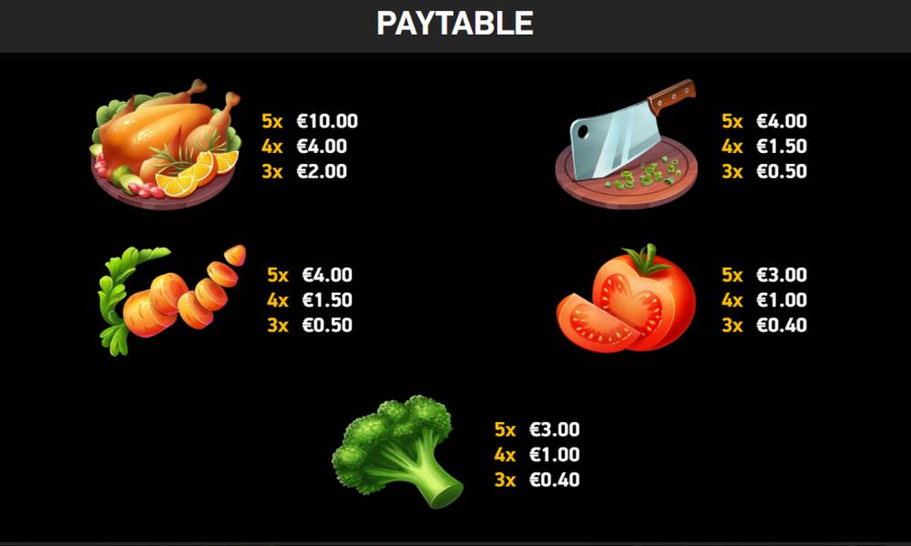 | Theme | Animals, Fruit/Vegetables, Gold, Luck, Action, Food, Luxury, Money |