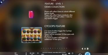• Cyclops Free Spins is ten free spins during which the casino places the bet instead of the gambler. All wins are tripled here. When you move to the following level the extra multiplier rises up to x3 and you get fifteen spins. They can be prolonged.