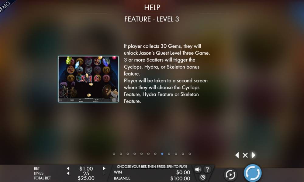 • Hydra - this feature is available starting from the second level. Jason attacks the Hydra three times cutting off the monster’s head. Lucky attempts bring payoffs or extra multipliers. Quantity of hits, wins and multipliers are increased at the third level.
