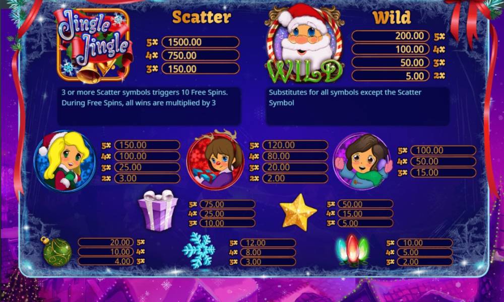 2. Scatter (a logo of «Jingle Jingle») doesn't depend on active lines and brings payoffs calculated by total bet. Three and more Scatters trigger free spins.