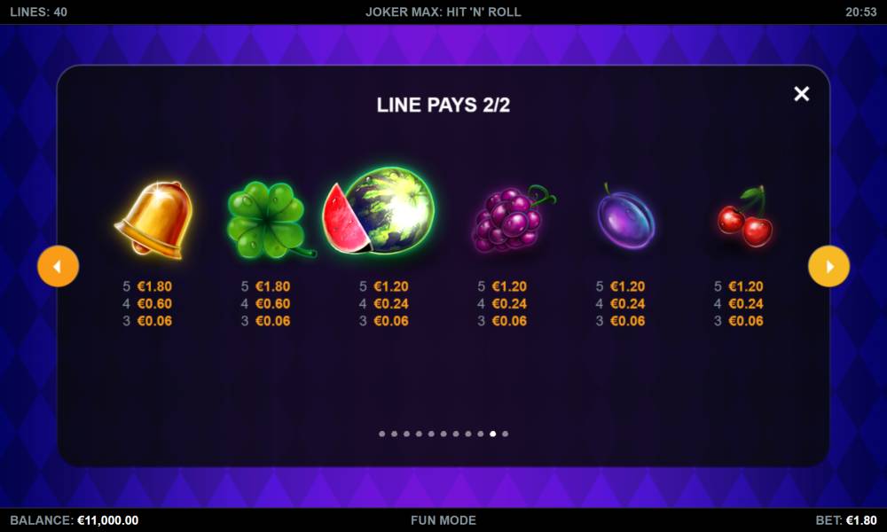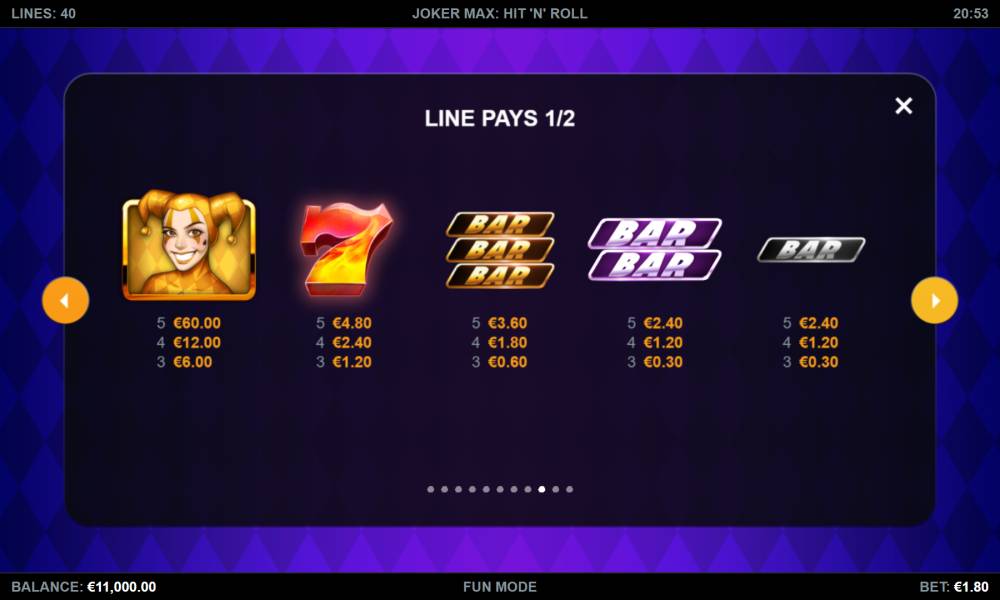 The Joker Max: Hit ‘n’ Roll slot machine from the Kalamba provider has a standard playing field, consisting of 5 reels with 4 symbols. All payouts are made on 40 pay lines.
