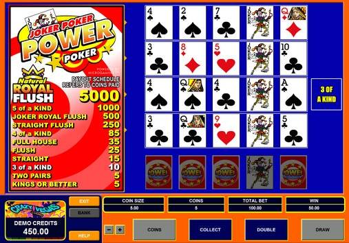 Joker Poker Power Poker has classic poker hands from a pair of kings to a royal flush, as well as a joker royal flush and a five of a kind.