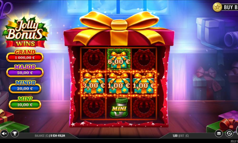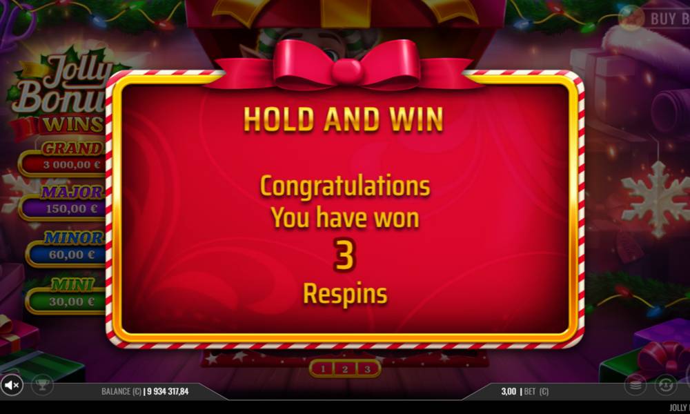 The Jolly Bonus Wins online slot is played on 3 reels in 3 rows with 1 payline located in the center of the playing field vertically or horizontally. With each spin, different symbols fall on the reels, from blank symbols to jackpots and those with cash value. When 3 special symbols fall on the middle reel and/or middle row, the Hold & Win feature with respins is triggered. Until then, all money symbols are collected and hidden under the lid of the gift box, which is the playing field. Winnings collected by the Gingerbread Man symbol, including the Mini, Minor and Major special prizes, are paid out as an addition to any other wins. There are several features available in the game:
