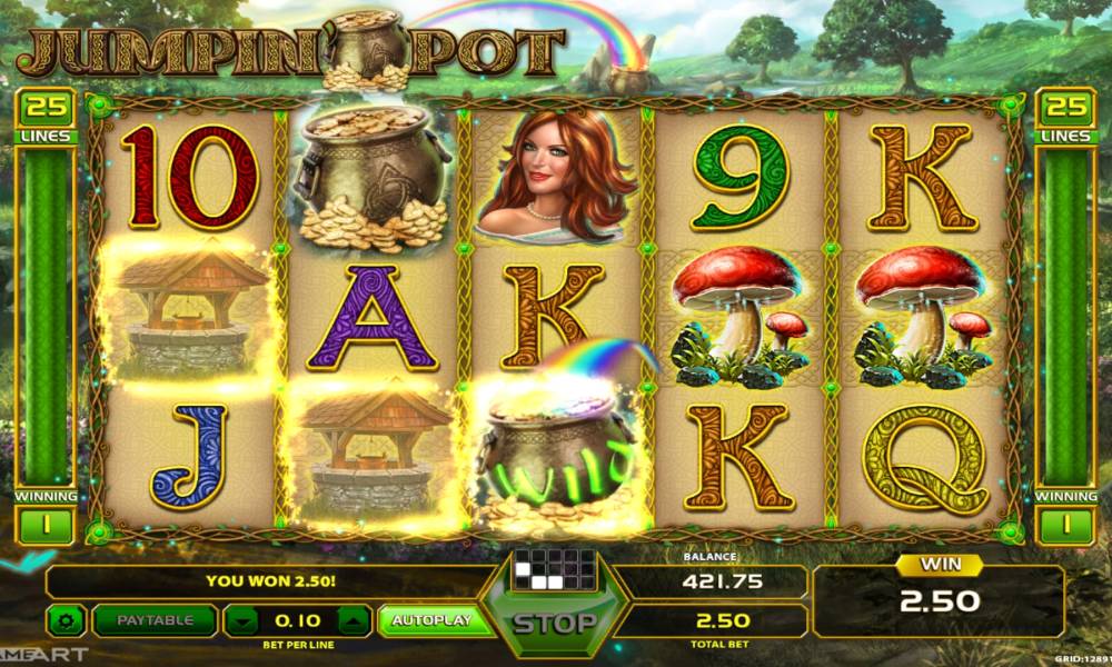 Here again we are talking about a slot machine, the main hero of which is a leprechaun. There is no secret this funny character of ancient Irish legends often becomes a hero of slot machines due to the modern developers. The slot named «Jumpin’ Pot» has been released by GameArt company. It is going to please you by amazing visuals and an excellent animation. The outstanding features of the interface and the gameplay are carefully described in the following review by the experts of Casinoz.club.
