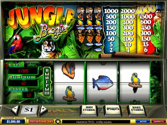 To start playing the slot, it is necessary to select the chip value. Choose the value that is suitable for you, depending on your financial capacities, among the chips of 5, 10, 25, 50 cents and $1, $2 and $5 for the big bets. Keep in mind that the bet is multiplied by the number of spinning reels. Then you can click on Bet One or Bet Max and adjust the desired number using Plus or Minus, which you will see from the left side. Clicking on Bet Max can activate the reels along with the button Spin, so that Bet Max is placed on the screen not in vain. The minimum bet in the slot machine Jungle Boogie is 5 cents and the maximum one per spin is $15, which you can lose or increase. The interface of the game will please users with its colors. It depicts the wild animals and birds that live in the jungle. They have become the symbols of the game. There are 8 winning combinations in the game. The payouts for them will be the following (values are mentioned in brackets for 1/2/3 bets): • 1 fish symbol (2/4/6) • 2 fish symbols (5/10/15) • 3 leopards (50/10/150) • 3 chimpanzees (100/200/300) • 3 fishes (150/300/450) • 3 parrots (200/400/600) • 3 baboons (500/1000/1500) • 3 tigers (1000/2000/4000)