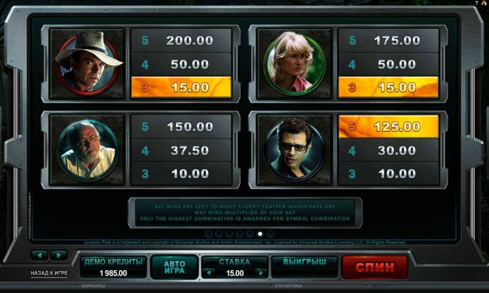 There are no active lines in its classic view in this mode, that’s why the bet is staked per spin. Its amount is always thirty divisible. Herewith, each of thirty parts can vary in range from one to ten coins of value of 0.01, 0.02 or 0.05 dollars. Consequently, playing Jurassic Park slot machine is possible by the maximal acceptable bet in amount of fifteen dollars per spin (by example of Unibet Casino).