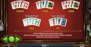 The poker combinations formed at the active line are charged with payoff in this slot machine. The minimal is Three of a Kind, while the maximal is Natural Royal Flush (without joker). There is also Four of a Kind with joker, which is the second by its value. The highest payoff index is x10000. Herewith, cards included into the paid combination. can be situated at any position of the line (they don't have to be necessary one after another). Please read about exceptions below.