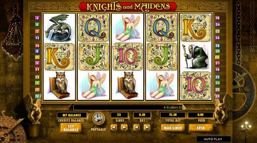 Knights and Maidens slot machine is a world of courageous knights, their beautiful beloved, tricky wizards and terrible dragons. All of them are imaged at the reels of this slot, where you can also see a castle, an owl as well as signs of the value of playing cards from ten to ace and other pictures.