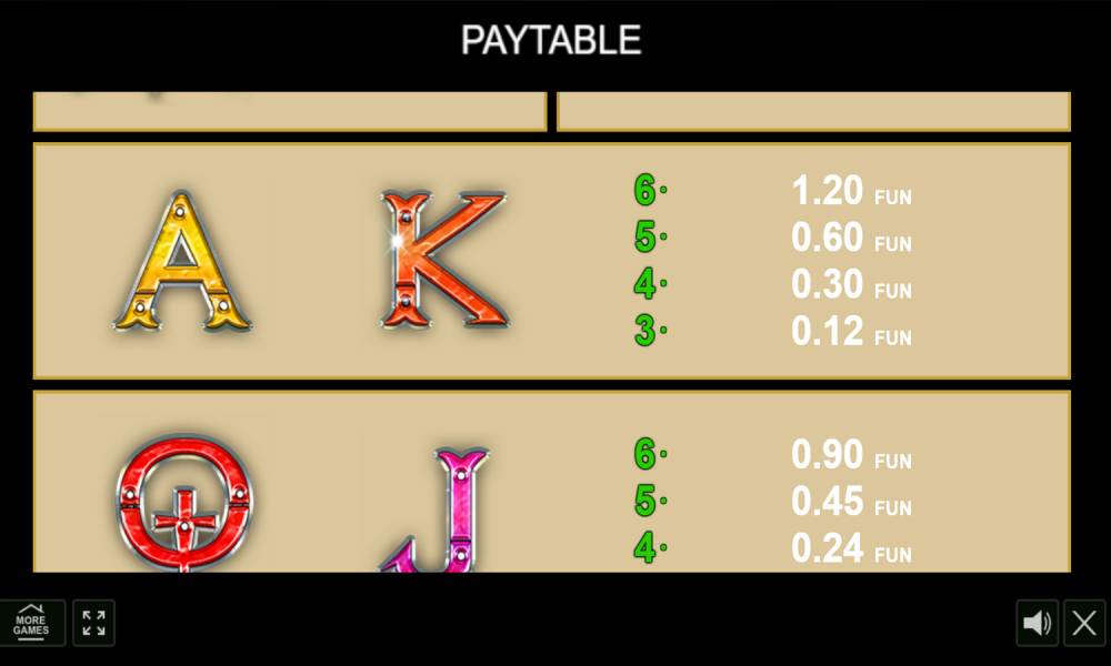 The five-reel slot with a 5x4 grid has 50 fixed paylines. The principle of combinations on them is simple - from 3 symbols from the first reel in a row. This rule works for 4 low-paying and 4 high-paying symbols. The two most expensive ones bring a payout from 2 pieces on the line. The maximum winnings are x1000. The online slot has a bonus round with free spins, a risk game and progressive jackpots. The bet per spin can be selected in a wide range - 0.01-1000 euros.